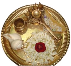 • ஒரு மேஜையில் ஆரத்தி செய்வதற்குத் தேவையான பொருட்களை தயார் நிலையில் வைக்கவும். ஆச்சமனா பாத்திரத்திலிருந்து சிறிது நீர் தெளித்து ஆரத்திக்குத் தேவையான பொருட்களை தூய்மைப்படுத்திக் கொள்ளவும்.