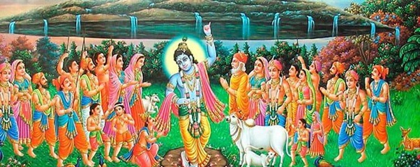 When the residents of Vṛndāvana prepared to worship Indra, the king of the demigods, Sri Krishna advised them instead to worship Govardhana Hill and the cows, as true sources of their prosperity.