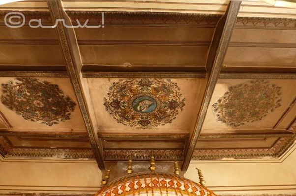 Paintings on the ceiling inside the sanctum. Ghat Ke Balaji temple