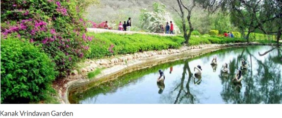Kanak Vrindavan is a garden in Jaipur, the capital of Rajasthan. It is built in a valley surrounded by Aravali hills and is located on the way to the Amer Fort at the bottom of the Nahargarh hill. The place is approximately 8 kilometers north of the Jaipur city. The garden has many nearby tourist attractions such as the Amer fort Palace, Jaigarh fort and Nahargarh Fort along with lush greenery.